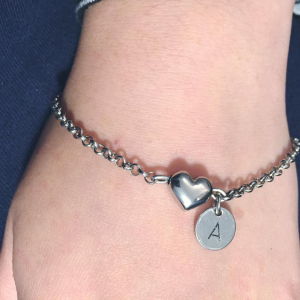 Armband i rostfritt stål med litet hjärta samt berlock med valfri bokstav.