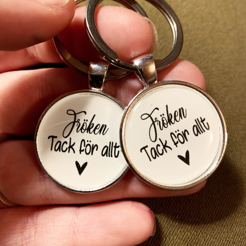 Nyckelring med texten: fröken tack för allt. Brickan mäter 25mm. Vill du ha annan text kommentera i kommentarsfältet i kassan.