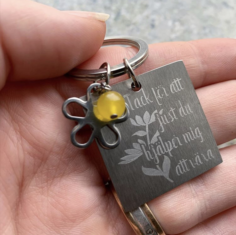 Nyckelring i stål - med texten: tack för att just du hjälper mig att växa, tillsammans med en liten pärla och en blomma.