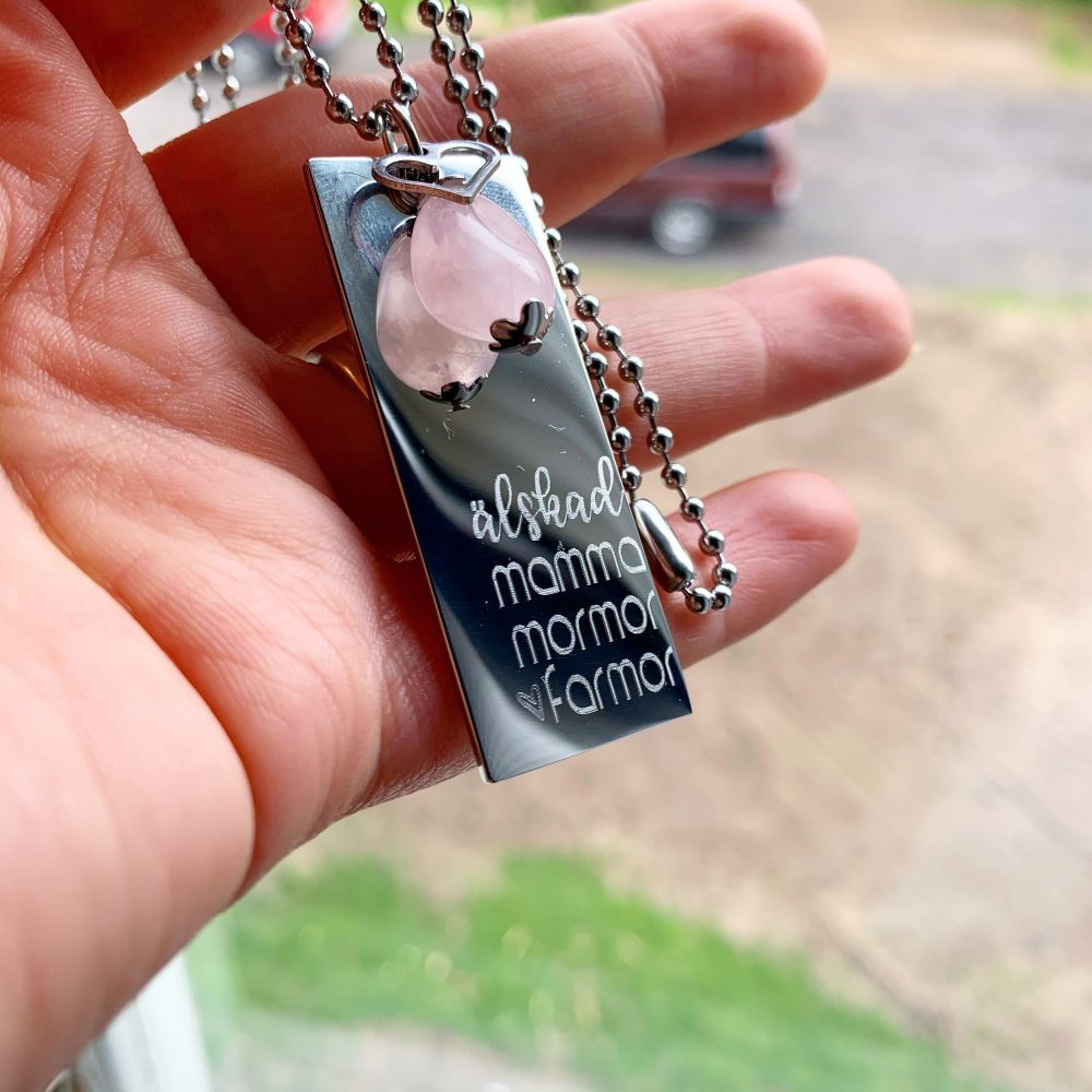 Halsband i rostfritt stål med gravyr. Litet hjärta och bumling av rosenkvarts ”Rosenkvarts ger lugn och förbinder den andliga dimensionen med kärlek och ger oss kärlek utan villkor och krav.