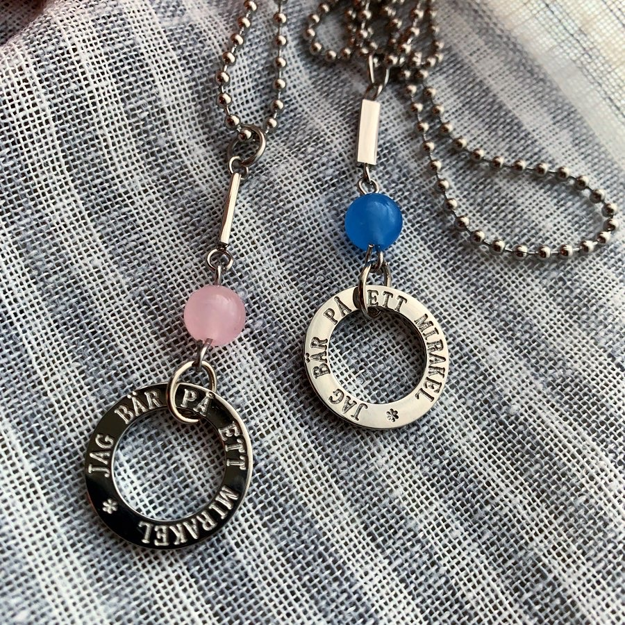 Halsband i rostfritt stål med glaspärla 8mm och en budskapsring: jag bär på ett mirakel.