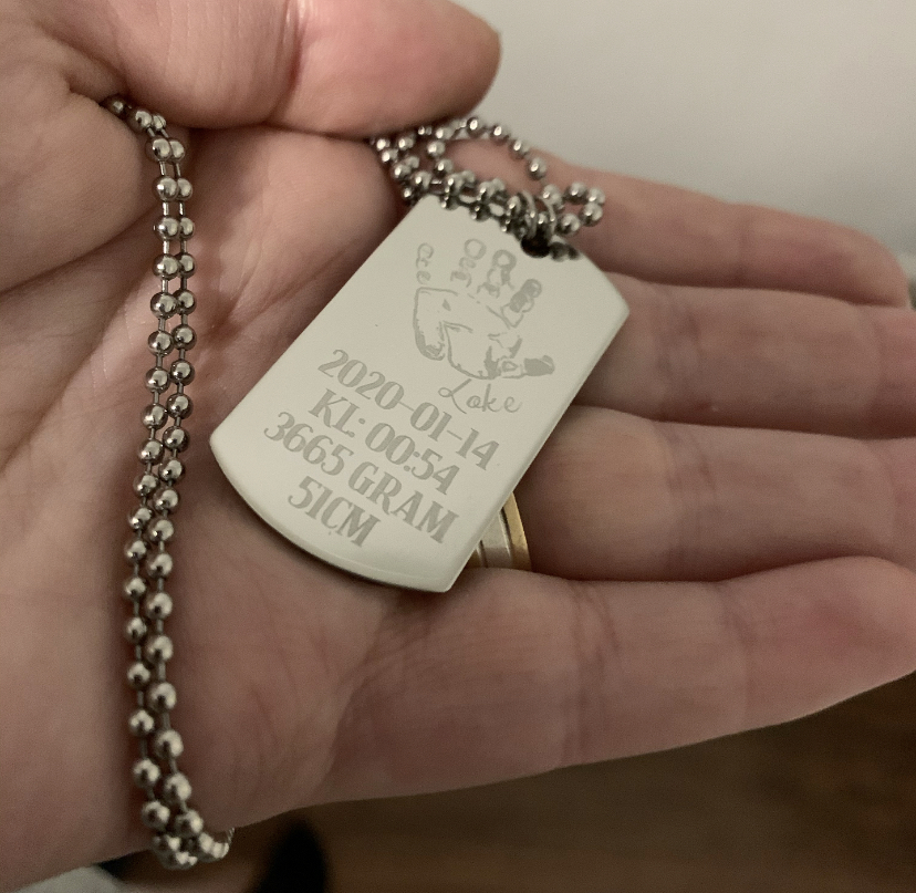 Halsband i rostfritt stål med valfri gravyr . Kommentera din text i kommentarsfältet innan du lägger din beställning. Kommentera om du vill ha kulkedja eller läderband i kommentarsfältet i kassan.