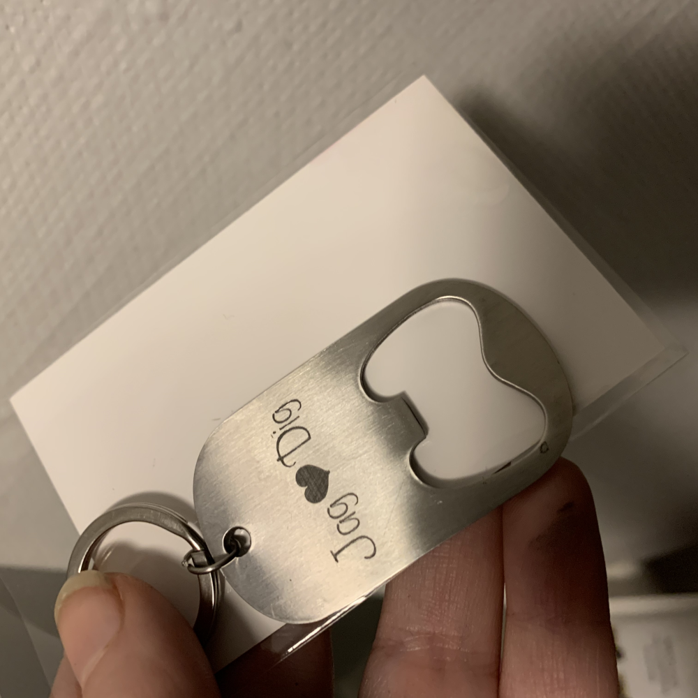 Nyckelring i form av en kapsylöppnare i rostfritt stål med gravyr.