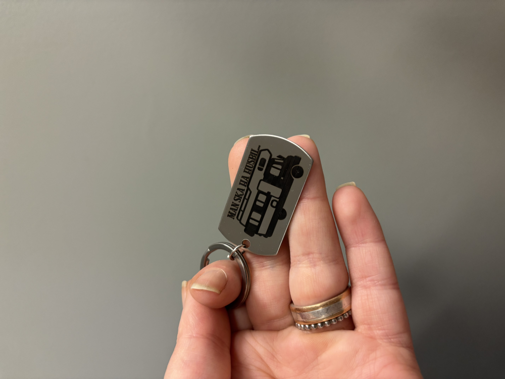 Nyckelring i stål med texten: man ska ha husbil och symbol: husbil