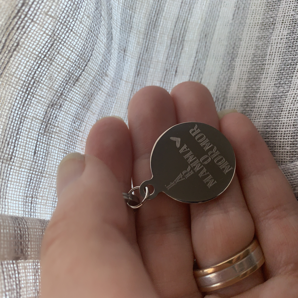 Nyckelring i rostfritt stål med gravyr. Brickan mäter 25mm. Valfri text - kommentera din text i meddelandefältet i kassan. Skriv även om du vill ha texten ihopflätad likt bilden eller om du vill ha texten under varandra.