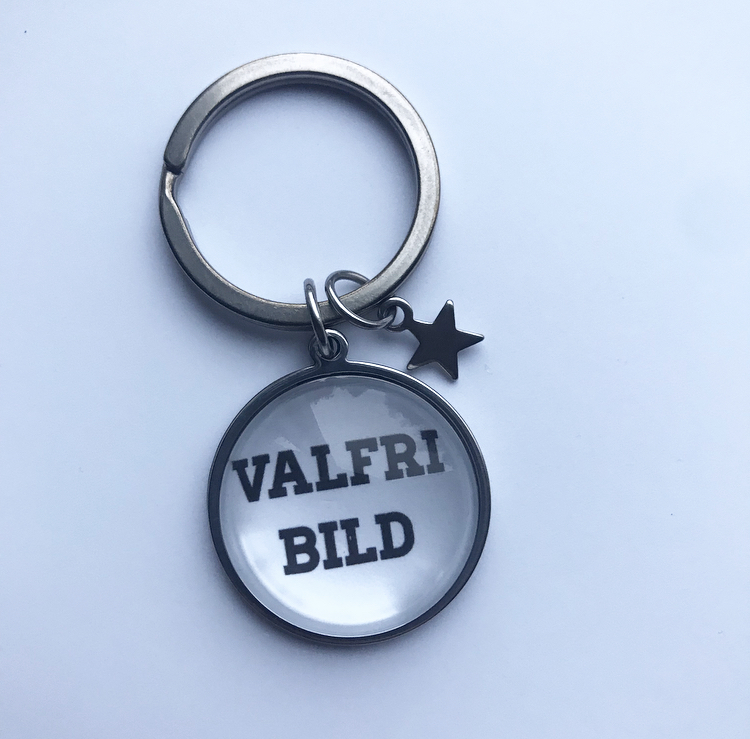 Nyckelring i rostfritt stål med glasbubbla med liten berlock.
