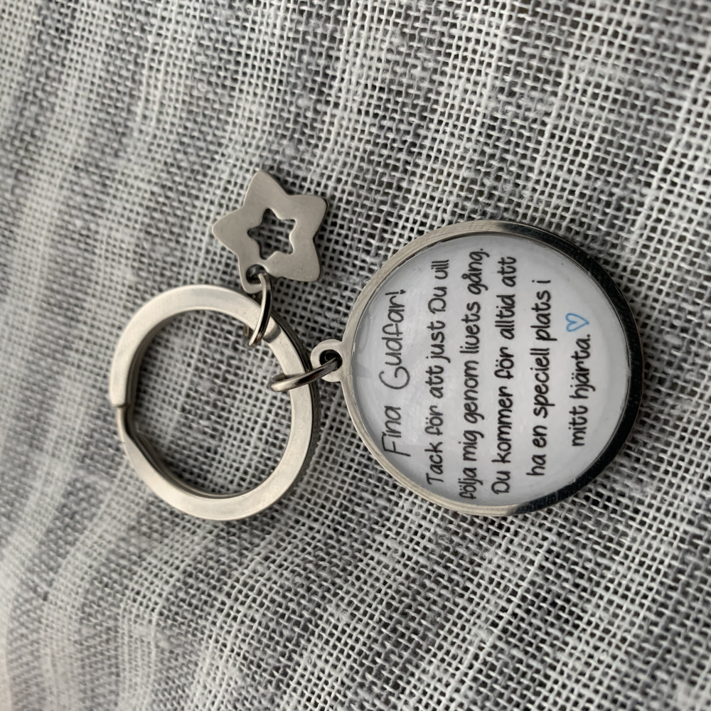 Nyckelring i rostfritt stål med glasbubbla med liten berlock.