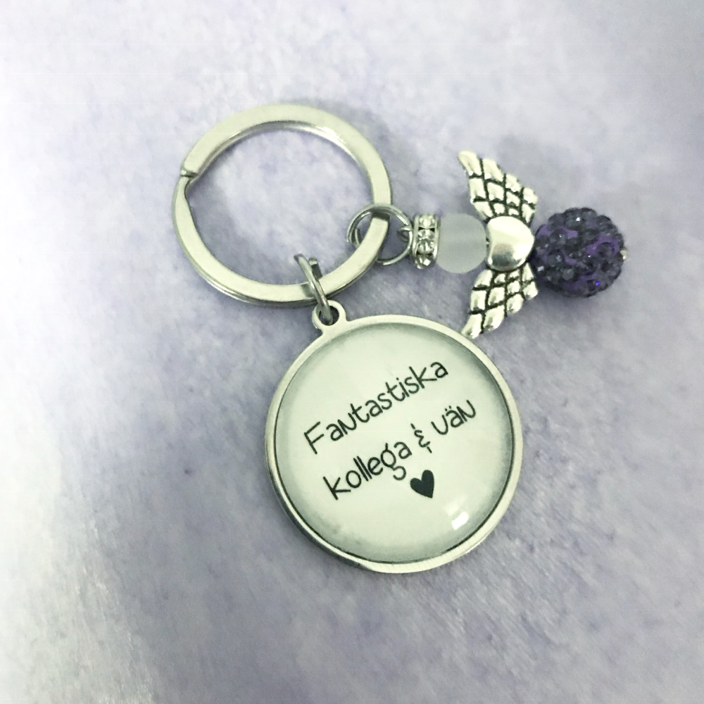 Nyckelring i rostfritt stål med strassängel. Kommentera sin text och färg i kommentarsfältet i Kassan.