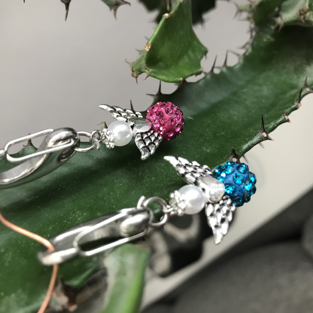 Lyckoängel med stort klolås i rostfritt stål. Valfri strasspärla med passande huvudpärla. (Kan därför variera mellan färgerna på ¨huvudpärlorna¨)