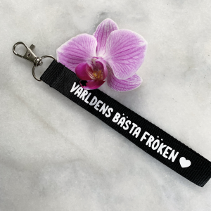 Nyckelband: MINI i SVART. Valfri text. Ca 17x2cm